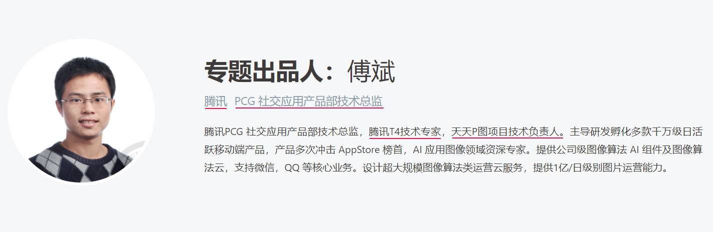 刚刚我有提到QCon,这是我们技术领域规格很高的盛会。QCon 2019北京站,有一个人工智能专题,策划人是傅斌。你可以看到,傅斌的名字下面,有腾讯、PCG社交应用产品部技术总监、还有天天P图项目技术负责人等信息,这些都是他的标签。