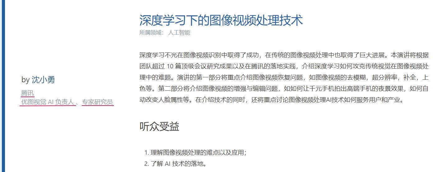 在这个专题下,有一位嘉宾沈小勇,对他的简介是腾讯、优图视觉AI负责人、专家研究员。