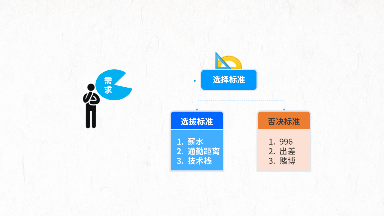 像我就想进大厂,我希望做图像处理算法方向的工作,我最看重薪水,这些都是接近型需求,描述的是我想要怎么怎么样。从接近型需求出发,可以建立选拔标准。选拔标准的意思是,目标Offer要匹配这个标准,才可以进入考虑范围。