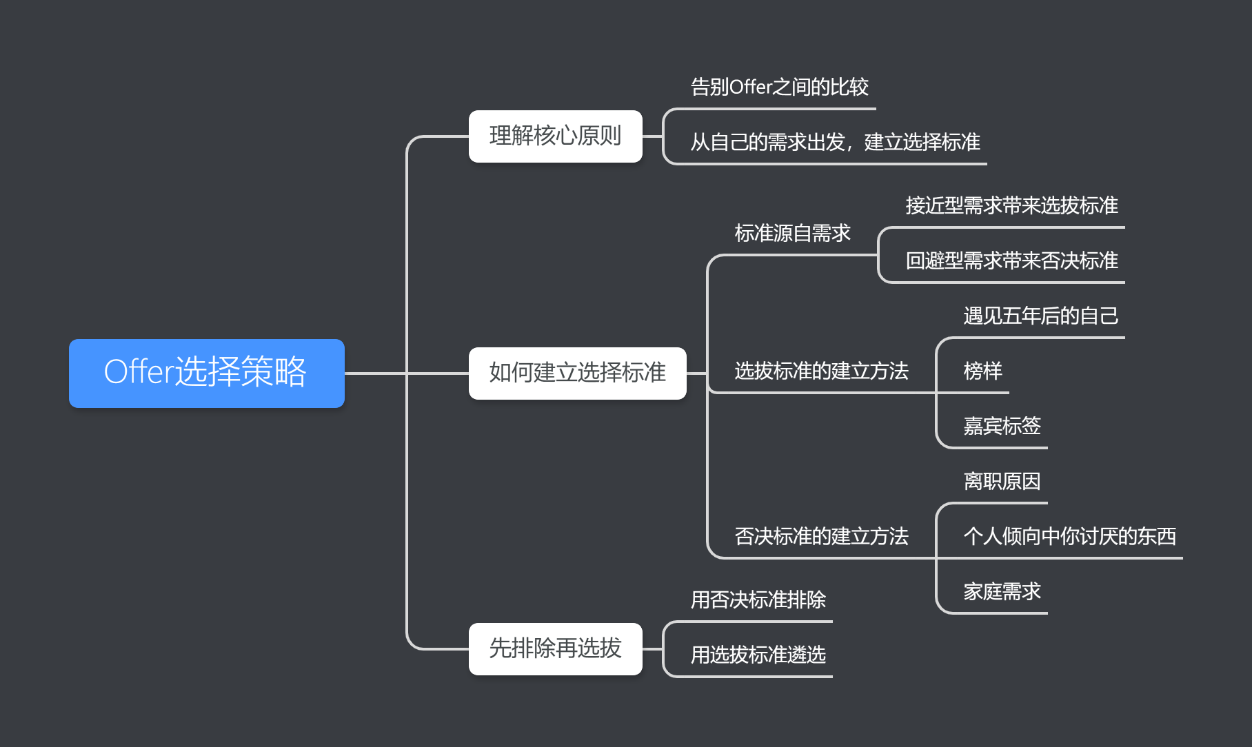 以上就是我今天分享的Offer选择策略,最后来总结一下:我先指出了在Offer之间比来比去这种错误做法,提出来选择Offer的核心原则,是从自己的需求出发,建立选择标准;然后介绍了正向的选拔标准和反向的否决标准,并讲解了建立这两类标准的方法;最后,我给出先排除后选拔的选择逻辑,帮助你更好的选出适合自己的Offer。