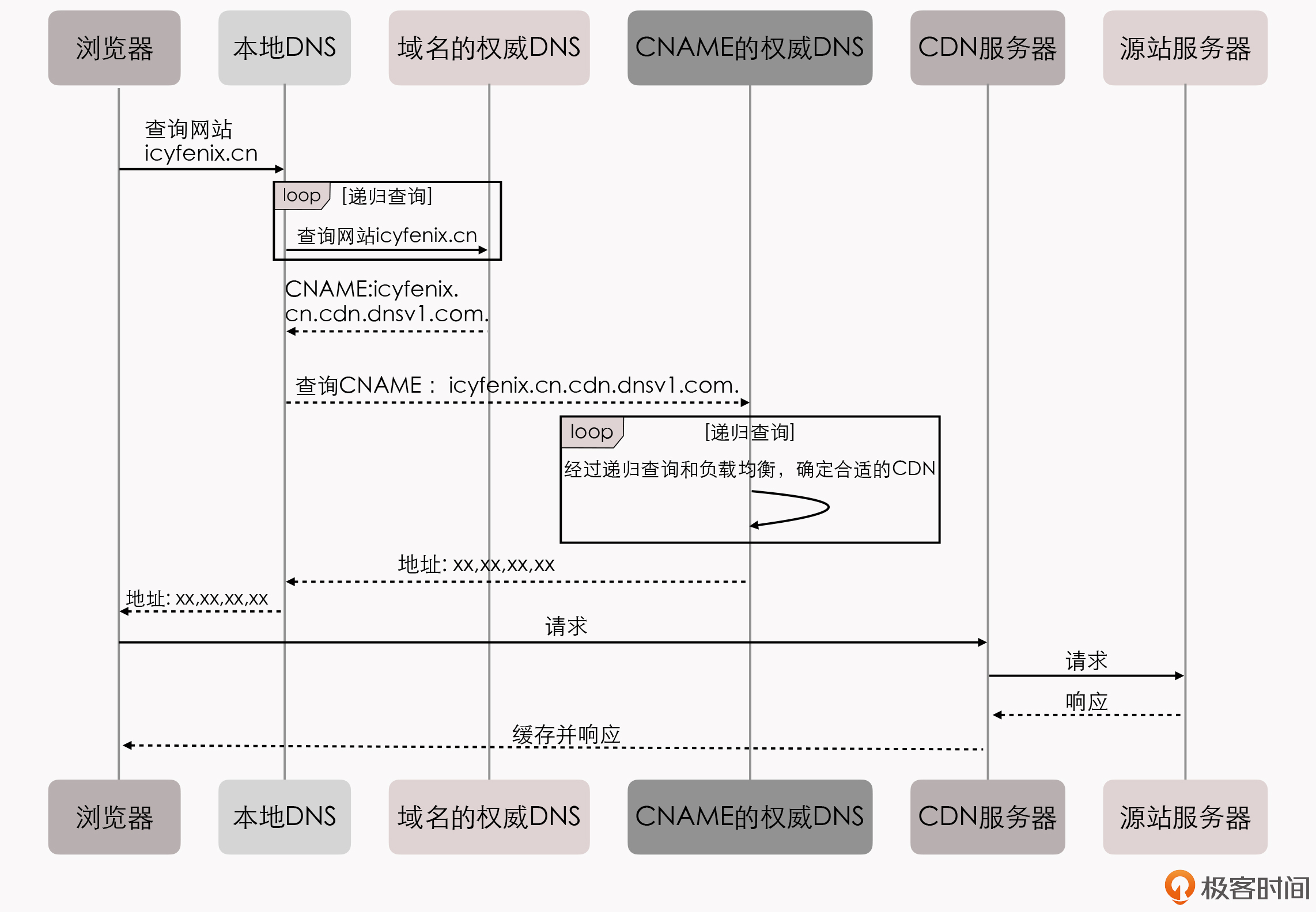 那么,把前面解析的这个步骤反映在时序图上,会是什么样子的呢?你可以参考我在这里给出的图例,然后对比一下我在前面所给出的没有CDN参与的时序图,看看它们都有什么不同之处: