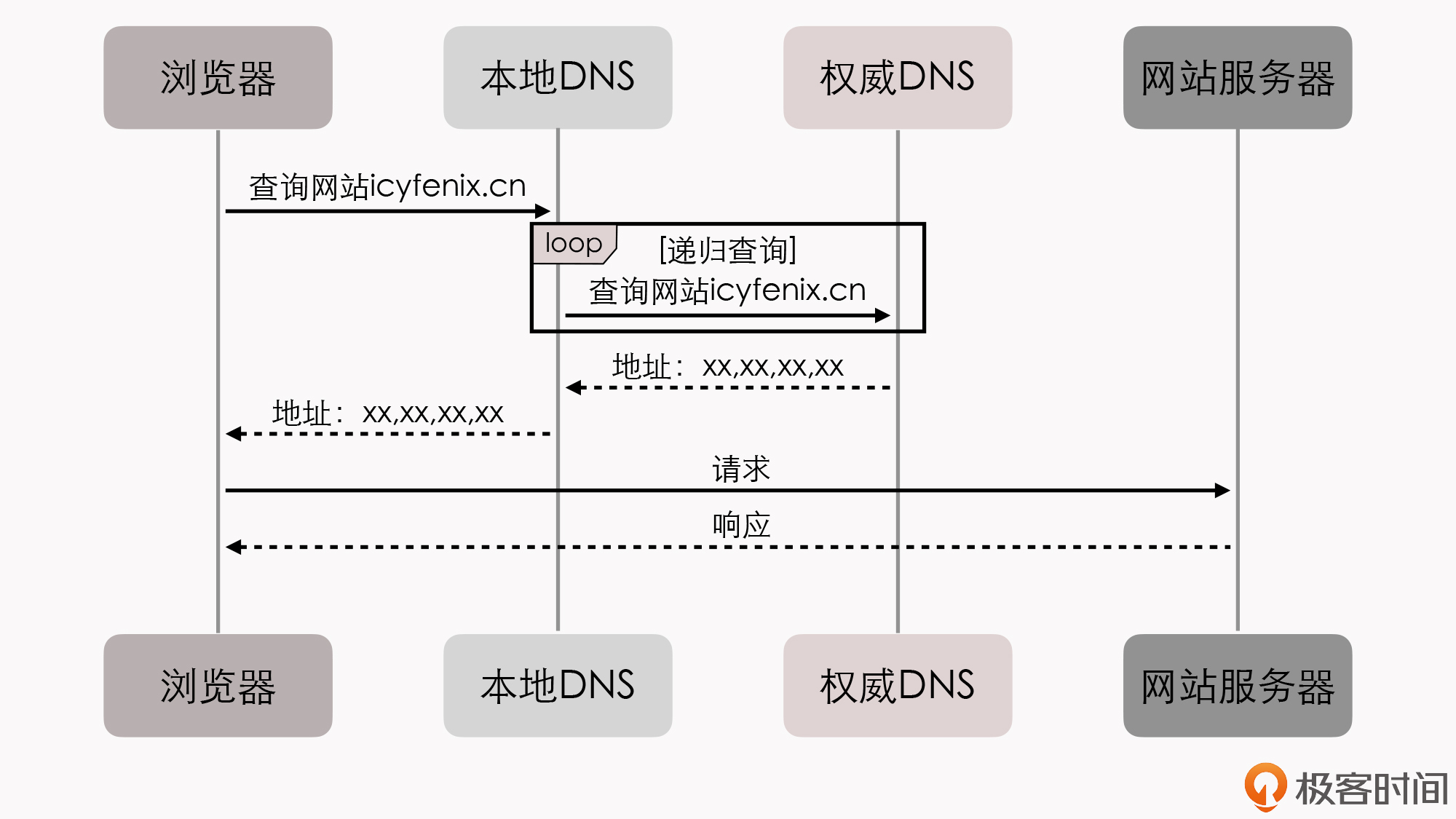 即查询icyfenix.cn的请求,发送至本地DNS后,会递归查询,直至找到能够解析icyfenix.cn地址的权威DNS服务器,最终把解析结果返回给浏览器。