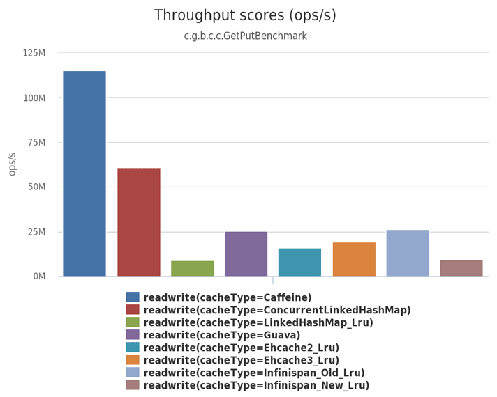根据Caffeine给出的一组目前业界主流进程内缓存的实现方案,其中包括了Caffeine、ConcurrentLinkedHashMap、LinkedHashMap、Guava Cache、Ehcache和Infinispan Embedded等缓存组件库的对比。从它们在8线程、75%读操作、25%写操作下的吞吐量表现Benchmarks来看,各种缓存组件库的性能差异还是十分明显的,最高与最低相差了足有一个数量级,你可以参考下图: