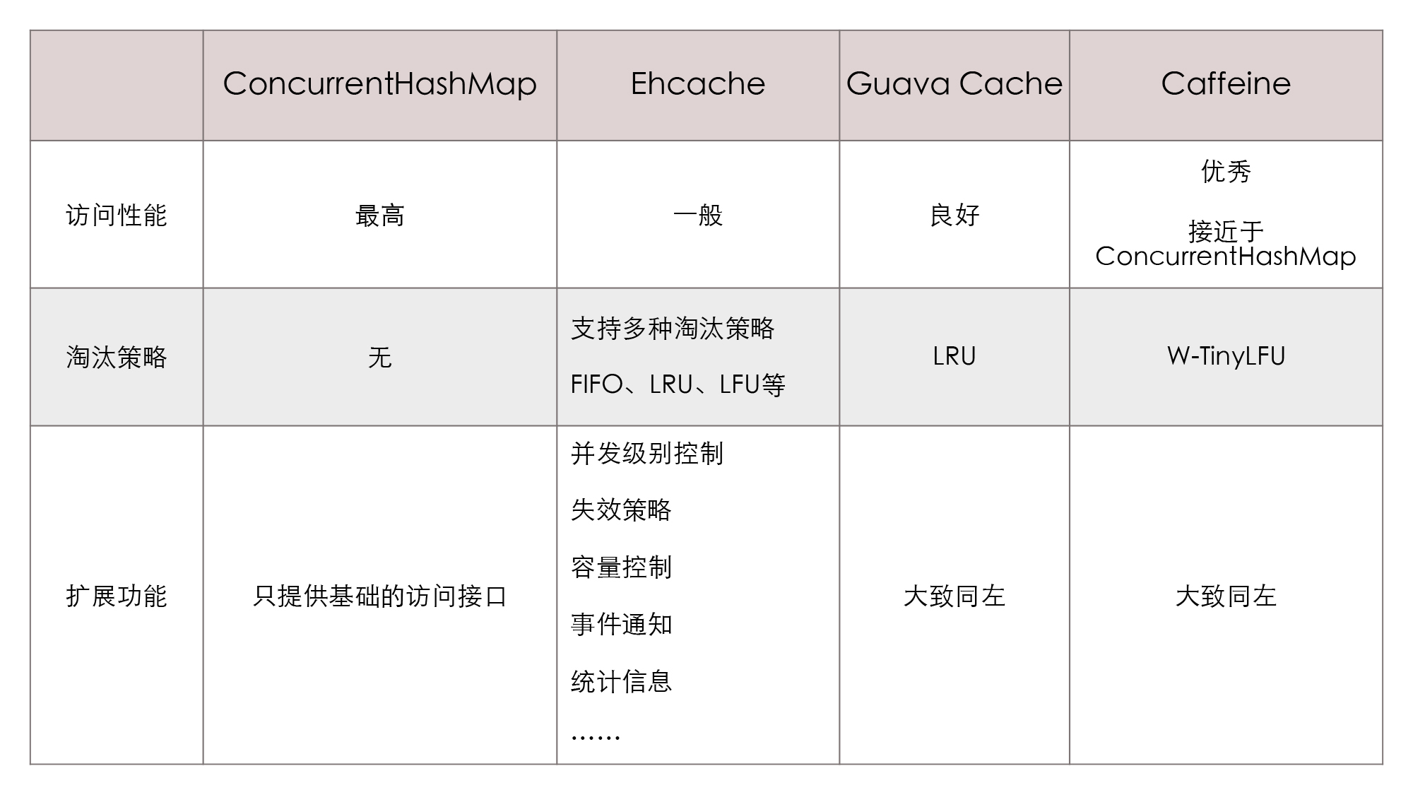 那么总的来说,表格里的四类就基本囊括了目前主流的进程内缓存方案。希望通过这节课的学习,你能够掌握服务端缓存的原理,能够独立分析各种缓存框架所提供的功能属性,明白它们有什么影响,有什么收益和代价。