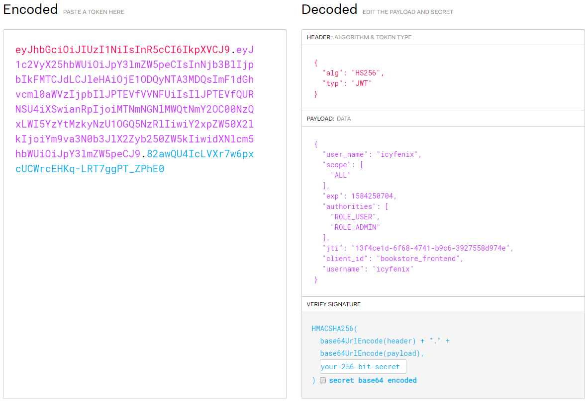 Authorization: Bearer eyJhbGciOiJIUzI1NiIsInR5cCI6IkpXVCJ9.eyJ1c2VyX25hbWUiOiJpY3lmZW5peCIsInNjb3BlIjpbIkFMTCJdLCJleHAiOjE1ODQ5NDg5NDcsImF1dGhvcml0aWVzIjpbIlJPTEVfVVNFUiIsIlJPTEVfQURNSU4iXSwianRpIjoiOWQ3NzU4NmEtM2Y0Zi00Y2JiLTk5MjQtZmUyZjc3ZGZhMzNkIiwiY2xpZW50X2lkIjoiYm9va3N0b3JlX2Zyb250ZW5kIiwidXNlcm5hbWUiOiJpY3lmZW5peCJ9.539WMzbjv63wBtx4ytYYw_Fo1ECG_9vsgAn8bheflL8
