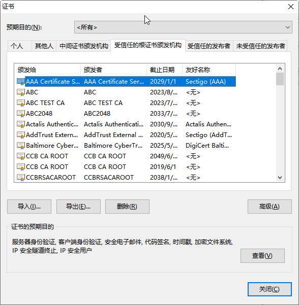 其实还是有差别的,世界上的公钥成千上万、不可枚举,而权威的CA中心则应该是可数的。“可数的”就意味着可以不通过网络,而是在浏览器与操作系统出厂时就预置好,或者是提前就安装好(如银行的证书)。比如说,下图就是我机器上现存的根证书: