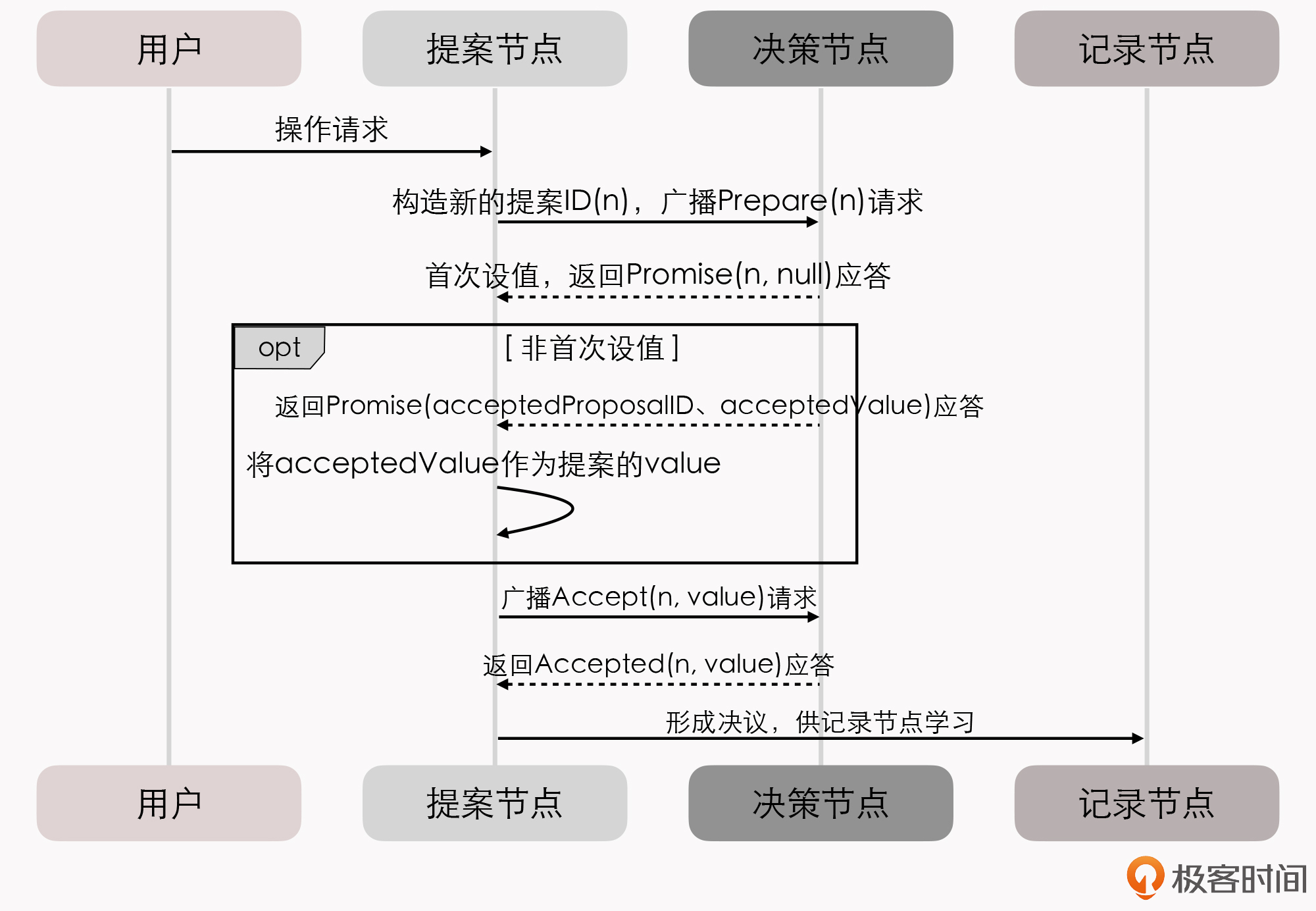 当提案节点收到了多数派决策节点的应答(称为Accepted应答)后,协商结束,共识决议形成,将形成的决议发送给所有记录节点进行学习。整个过程的时序图如下所示:
