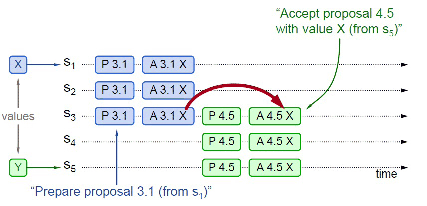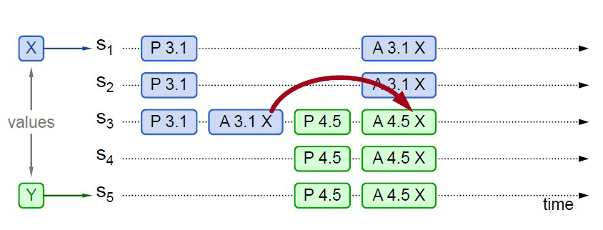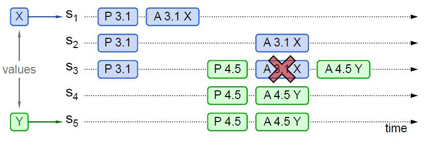 比如下图所示,S5发起提案的Prepare请求时,X并未获得多数派批准,但由于S3已经批准的关系,最终共识的结果仍然是X。