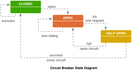 - HALF OPEN:是一种中间状态。断路器必须带有自动的故障恢复能力,当进入OPEN状态一段时间以后,将“自动”(一般是由下一次请求而不是计时器触发的,所以这里的自动是带引号的)切换到HALF OPEN状态。在中间状态下,会放行一次远程调用,然后根据这次调用的结果成功与否,转换为CLOSED或者OPEN状态,来实现断路器的弹性恢复。