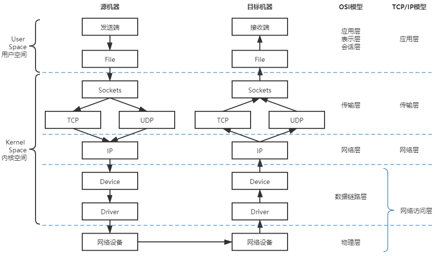 下图就体现了Linux网络通信过程与OSI或者TCP/IP模型的对应关系,也展示了网络栈中的数据流动的路径,你可以看一下: