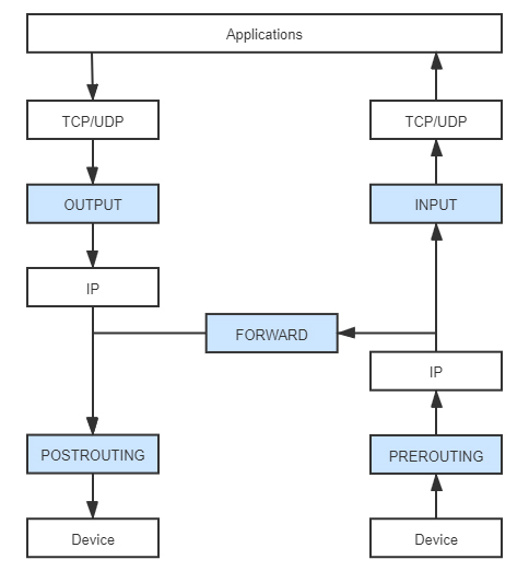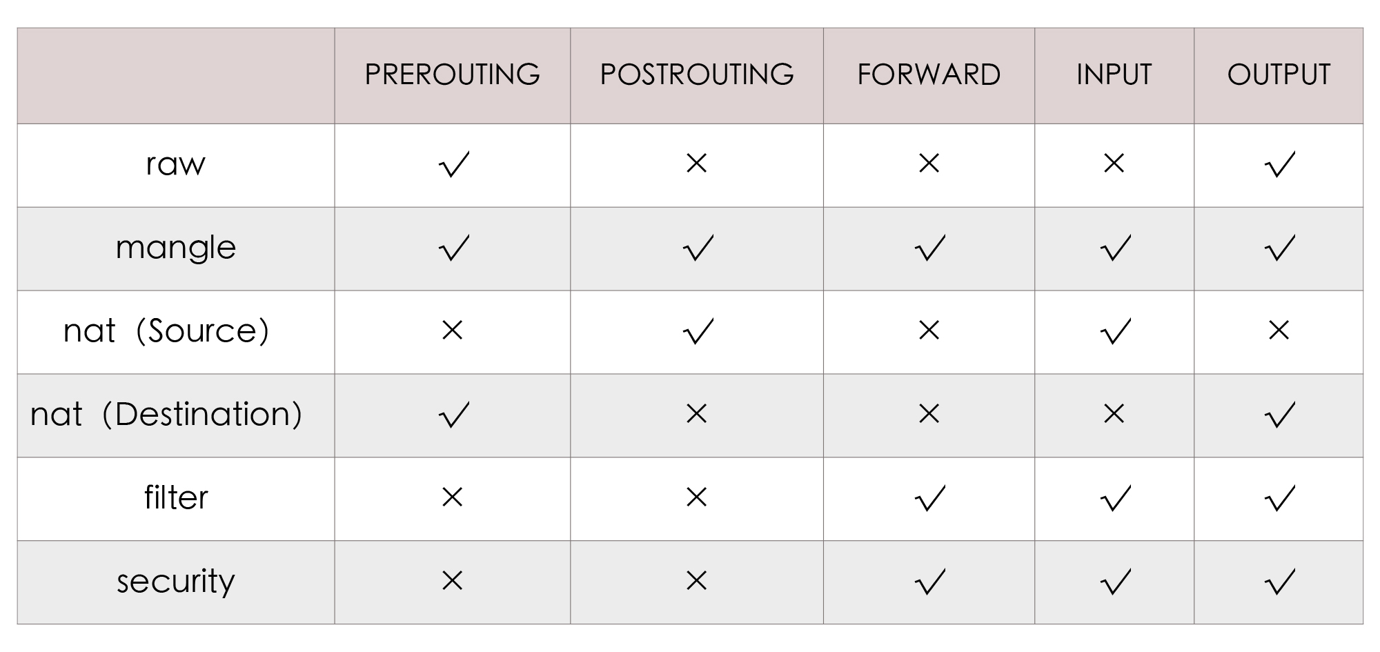 当然,这些行为本来能够被挂载到Netfilter钩子的回调链上,但iptables又进行了一层额外抽象,它不是把行为与链直接挂钩,而是会根据这些底层操作的目的,先总结为更高层次的规则。