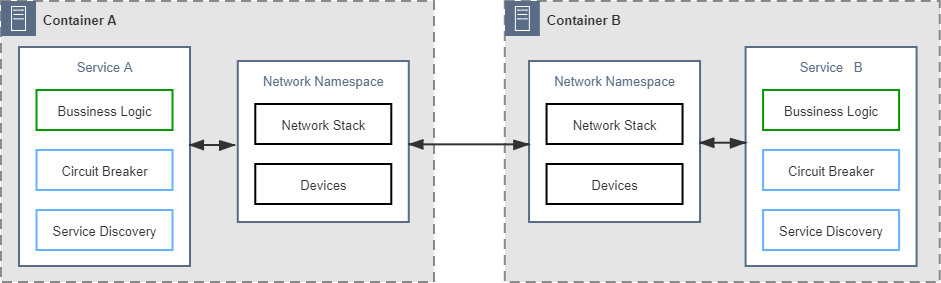 为了能够让分布式通信组件与具体的编程语言脱钩,也为了避免程序员还要去专门学习这些组件的编程模型与API接口,这一阶段进化出了能专门负责可靠通信的网络代理。这些网络代理不再与业务逻辑部署于同一个进程空间,但仍然与业务系统处于同一个容器或者虚拟机当中,它们可以通过回环设备甚至是UDS(Unix Domain Socket)进行交互,可以说具备相当高的网络性能。
