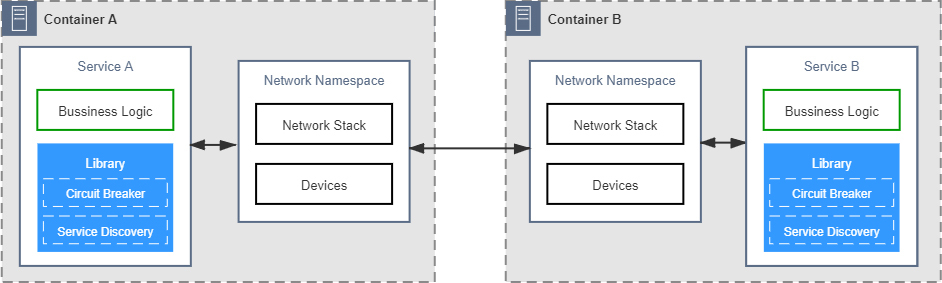 这些通信的逻辑由业务系统的开发人员直接编写,与业务逻辑直接共处在一个进程空间之中,如下图所示(注:这里以及后面的一系列图片中,我会以“断路器”和“服务发现”这两个常见的功能来泛指所有的分布式通信所需的能力,但你要知道实际上并不局限于这两个功能)。