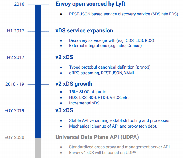 基于UDPA的xDS v4 API,原本计划会在2020年发布,进入Alpha阶段,不过,我写下这段文字的时间是2020年的10月中旬,已经可以肯定地说前面所列的这些计划一定会破产,因为从目前公开的资料看来,UDPA仍然处于早期设计阶段,距离完备都还有一段很长的路程,所以基于UDPA的xDS v4在2020年是铁定出不来了。