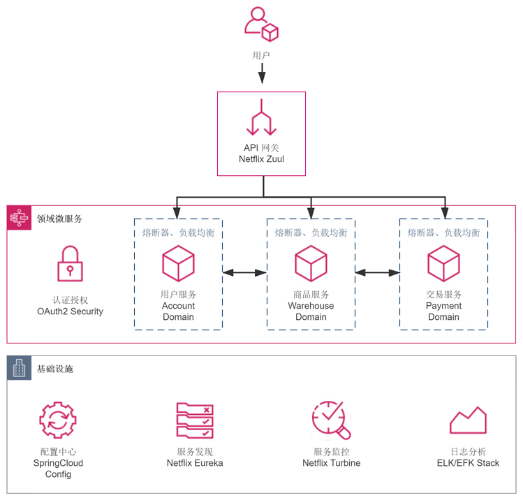 在我设定的演示案例中,准备把单体的Fenix's Bookstore 拆分为“用户”“商品”“交易”三个能够独立运行的子系统,它们将在一系列非功能性技术模块(认证、授权等)和基础设施(配置中心、服务发现等)的支撑下互相协作,以统一的API网关对外提供与原来单体系统功能一致的服务,其应用视图如下图所示: