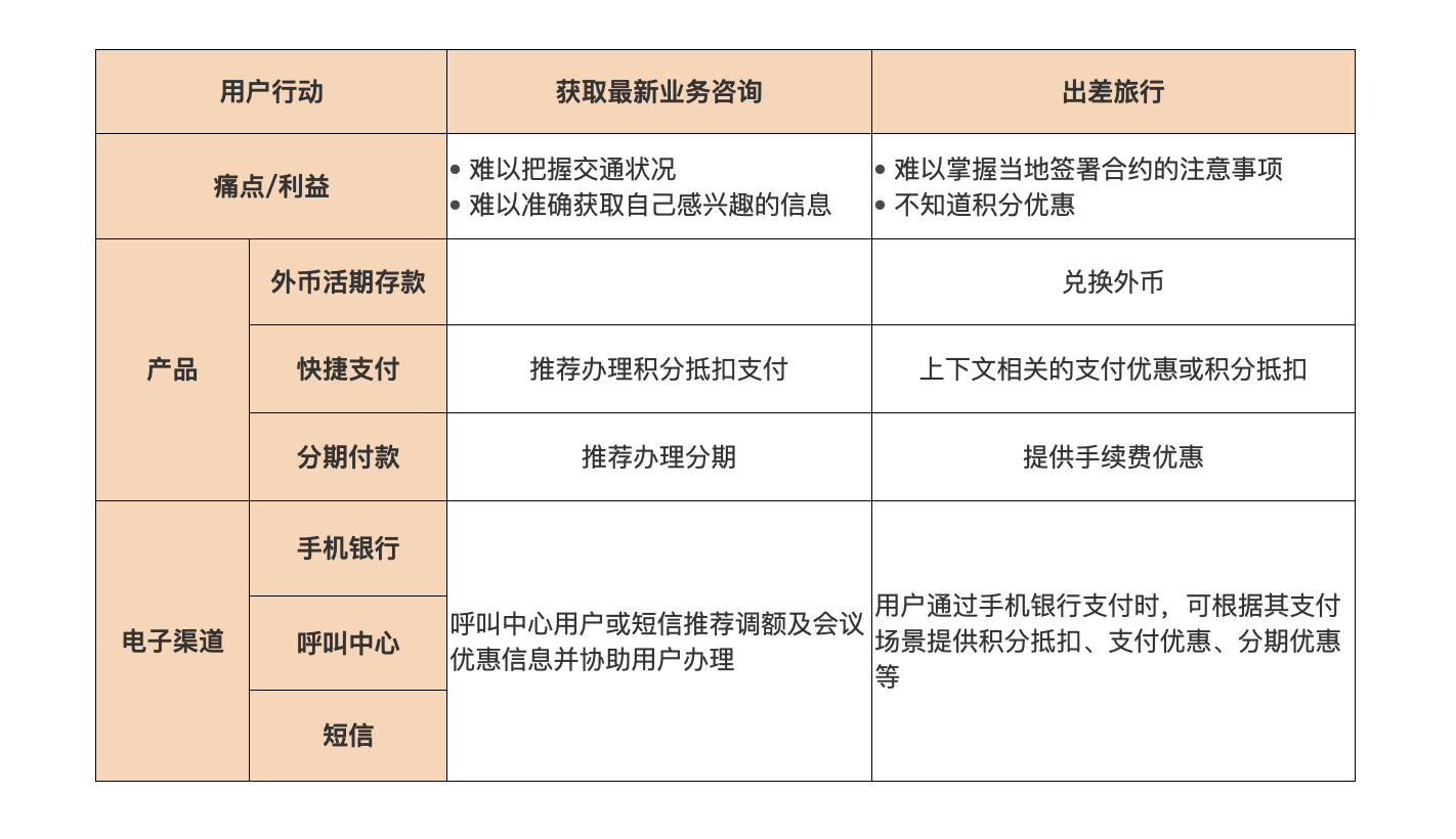 同时,我们知道在“获取最新业务咨询”用户行动中,用户的痛点是需要便捷地获取商旅信息,那么根据合作方提供的用户咨询动向,我们可以通过增加“智能匹配产品目标用户”功能,将与用户适配的产品通过短信银行和呼叫中心主动推荐给用户。