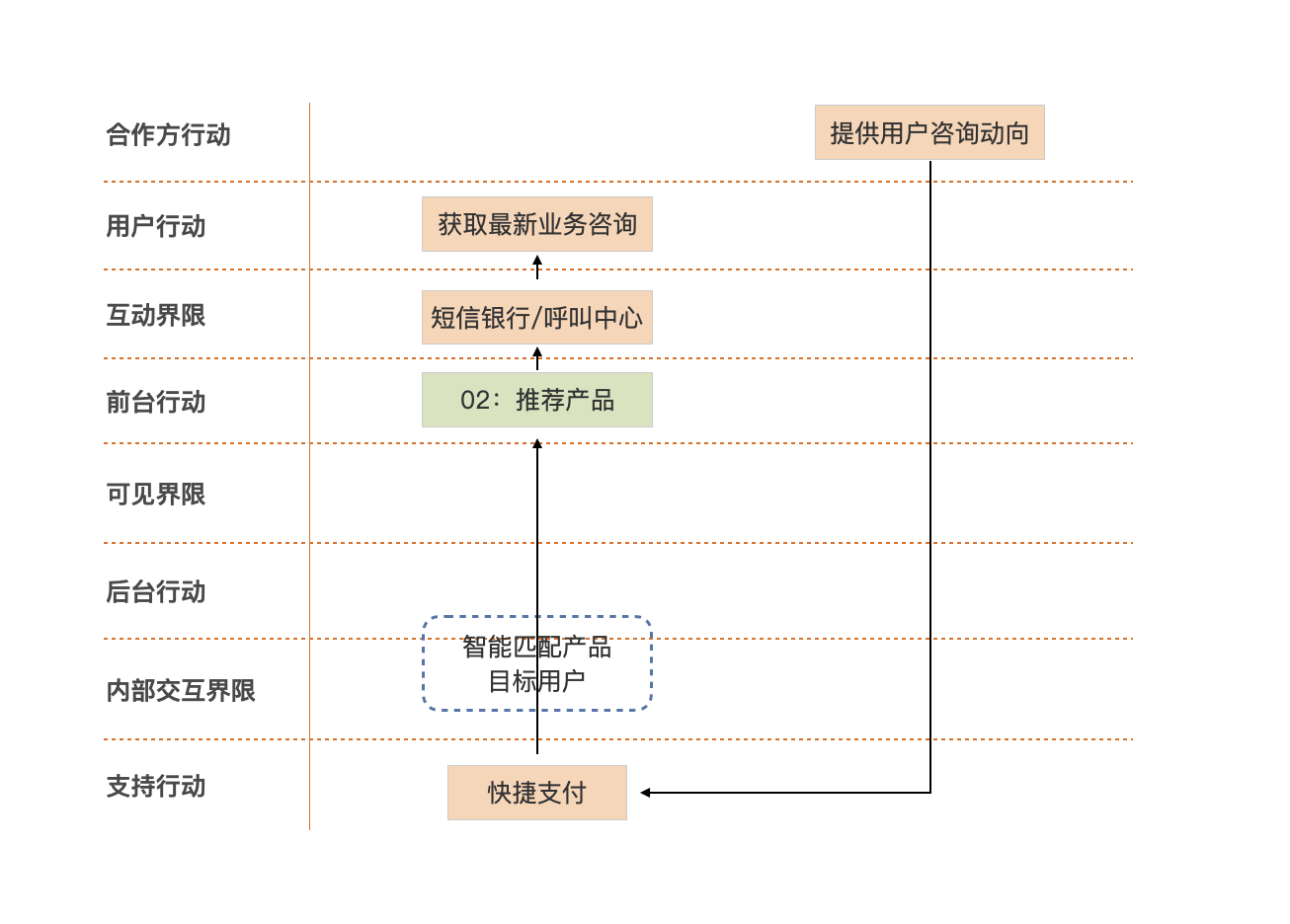 我们现在将视线聚焦到“获取最新业务咨询”用户行动上,对于旅途中的小企业主,最便捷的渠道就是短信银行、呼叫中心;相关方有提供商旅咨询的合作方,比如携程等;这样我们就定位了相关方和渠道。通过业务架构资产的关联关系,我们可以定位到上述渠道、相关方和产品共同关联的流程资产“推荐产品”和服务“快捷支付”。将上述分析结果区分界线进行摆放,则输出了下面这张服务蓝图。