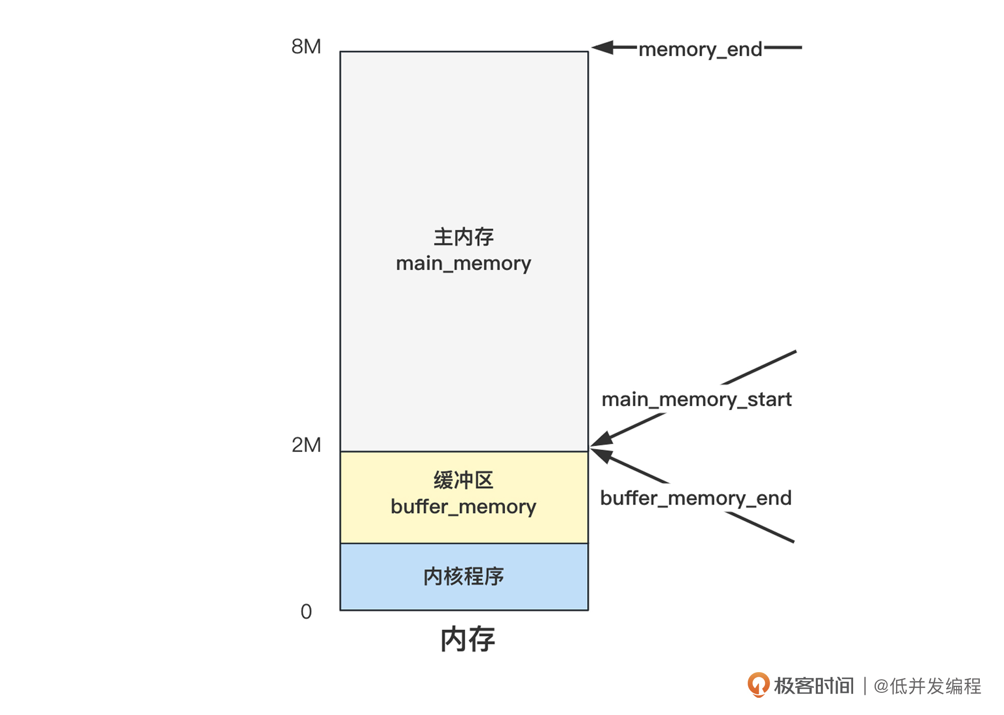 为了之后的内存划分,首先需要计算出两个边界值,将内存划分成了三个部分,分别是内核程序、缓冲区和主内存。