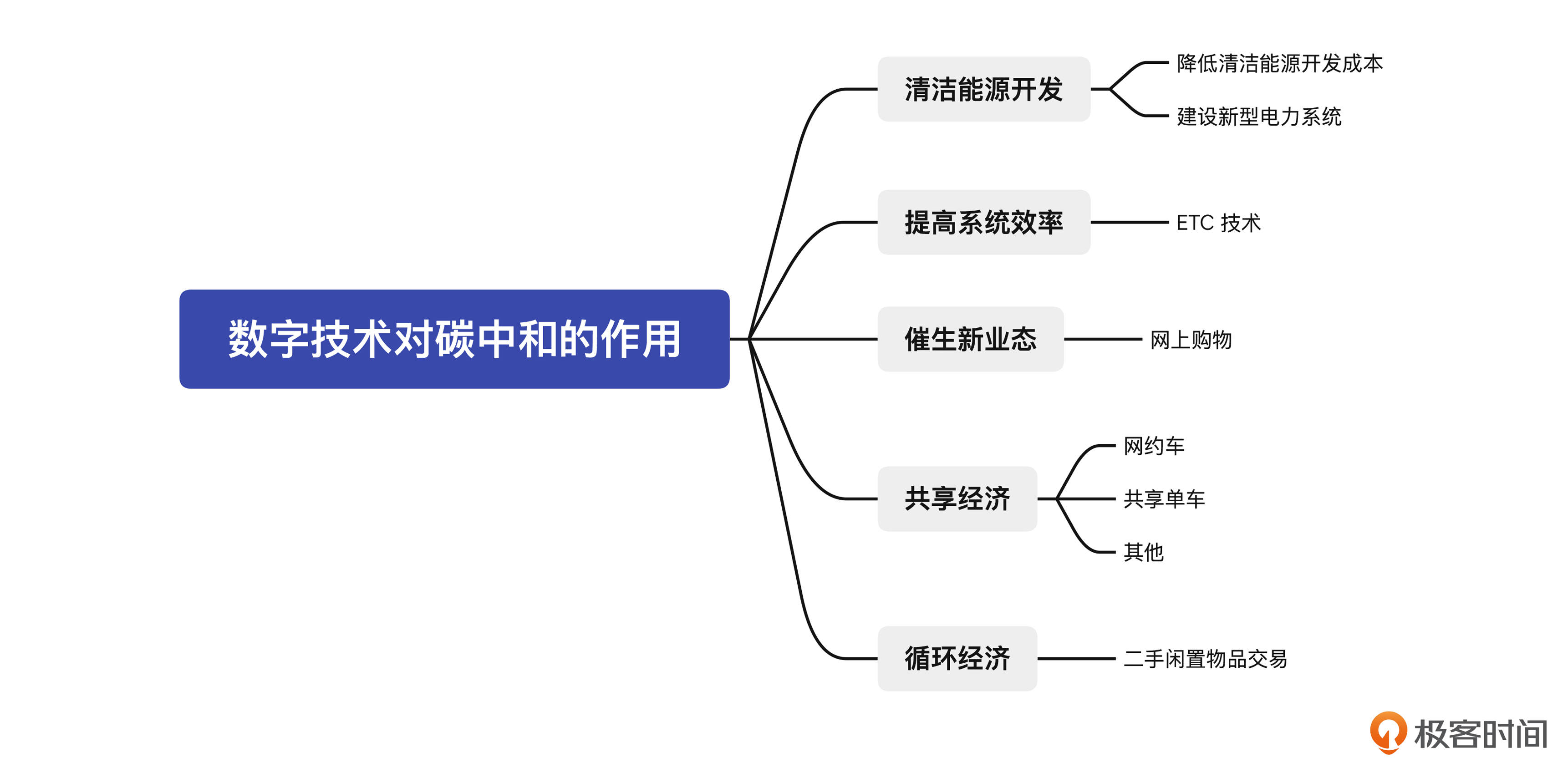 今天,我们一起了解了数字技术在清洁能源开发、提升系统效率、催生新业态及助力共享经济、循环经济中的巨大作用。我还画了一个思维导图,供你参考复习。