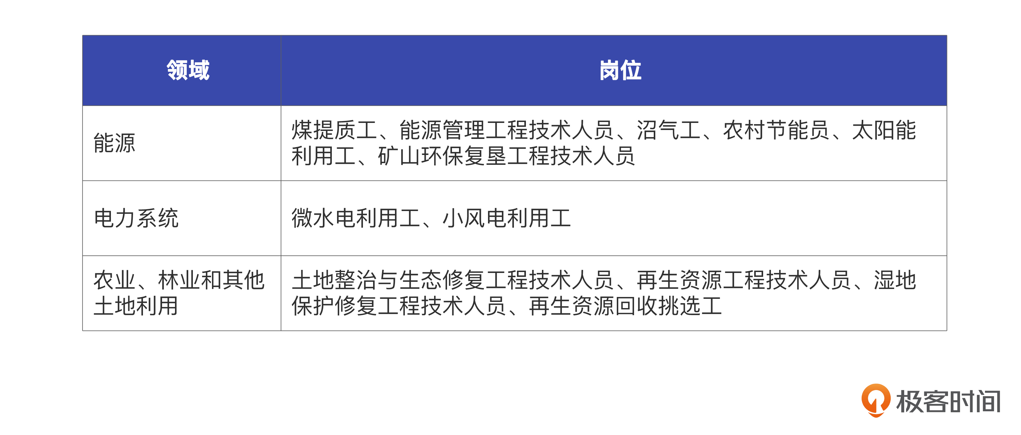 另外,值得我们注意的绿色职业和岗位还有后面这些,我列了一个表格供你参考。如果你有兴趣,可以课后继续探索了解。