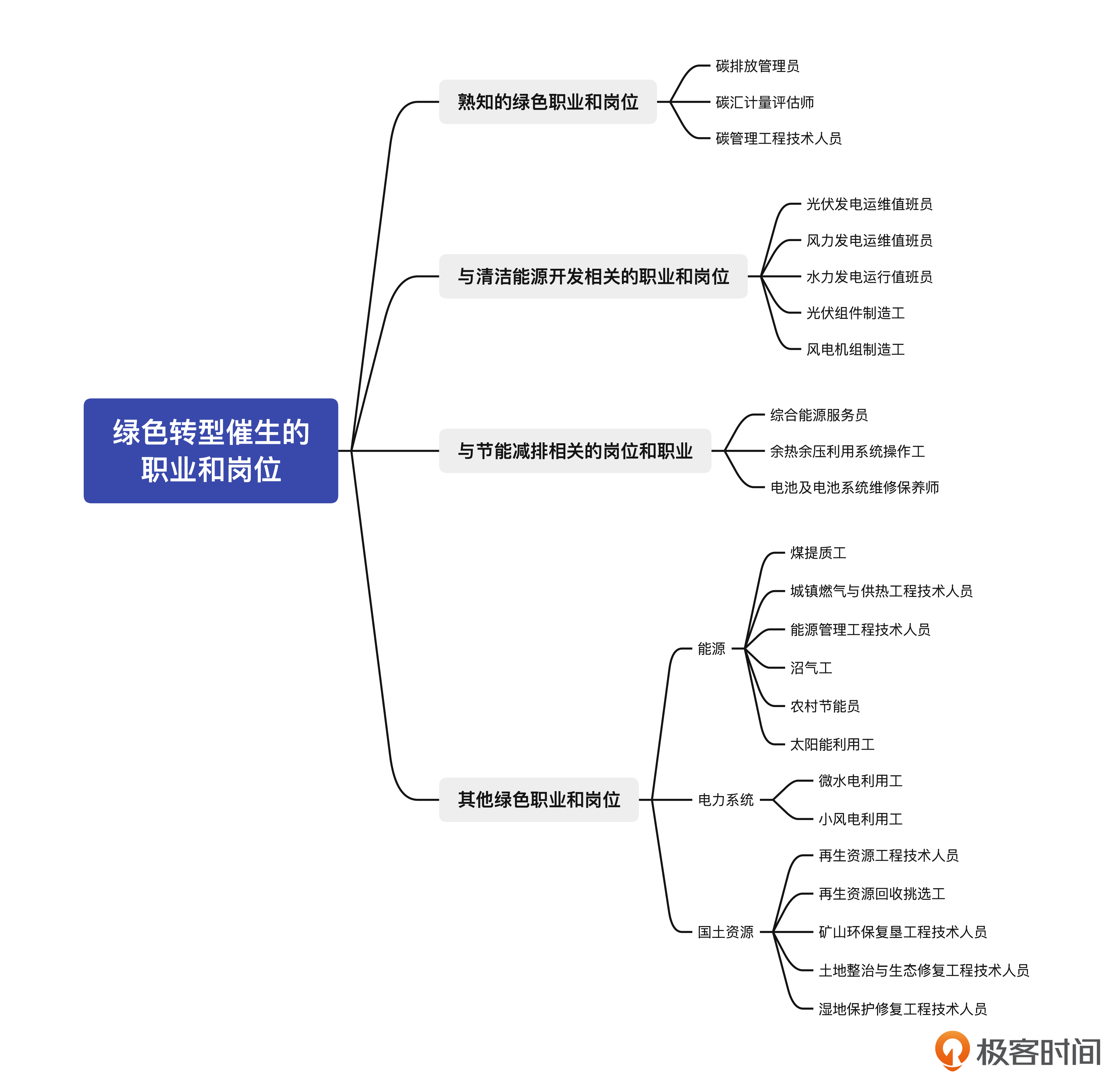 其他绿色转型催生的职业和岗位还有很多,我给你汇总了一个学习导图,供你复习回顾。