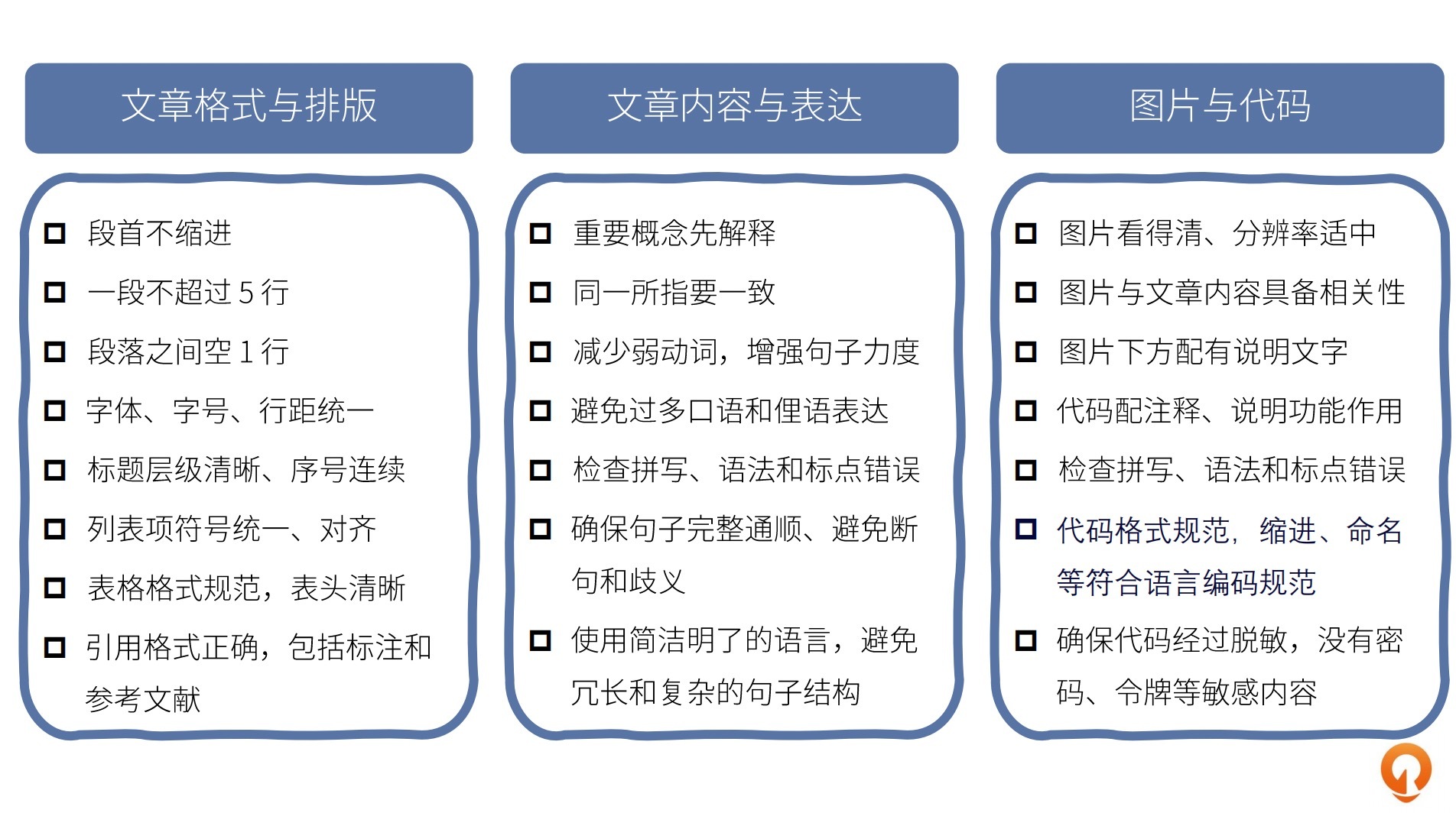 写文章时,如果有个能帮我们提前揪出错误的本地检查小助手,那就太棒了!虽然我们没有像 SonarLint 那样的检查清单来辅助本地审查,但宇新老师给出的检查清单(如图)同样可以助我们一臂之力。在提交前,我们只需对照清单,逐项解决问题,就能确保错误不会流转到下一道工序。