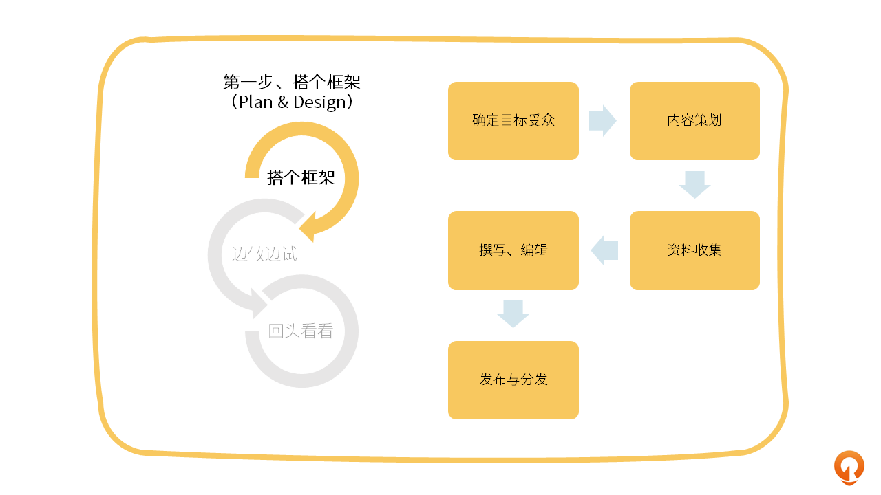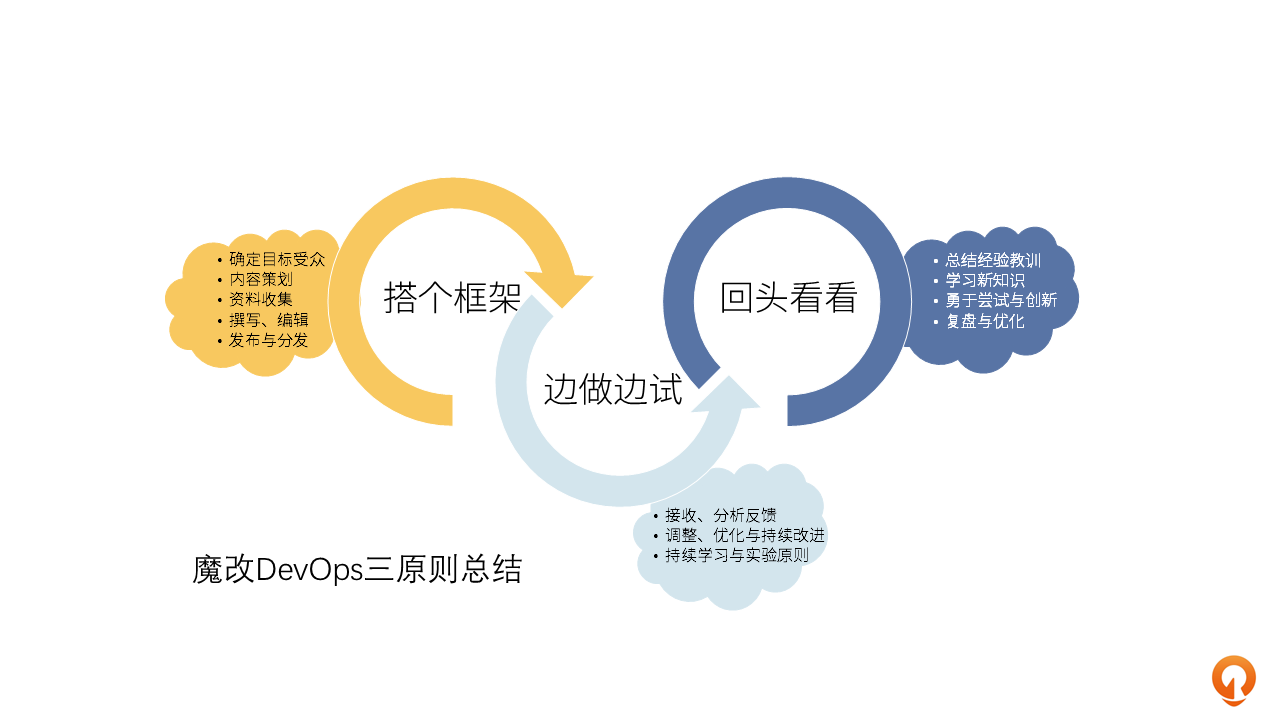 为了便于记忆,我们将 DevOps 的三步法则赋予了新的名字:搭个框架、边做边试和回头看看。借助这三步方法,我们可以持续地整合内容资源、定期发布更新内容,并根据读者反馈和市场变化进行调整和优化,从而提高我们的内容产出效率。