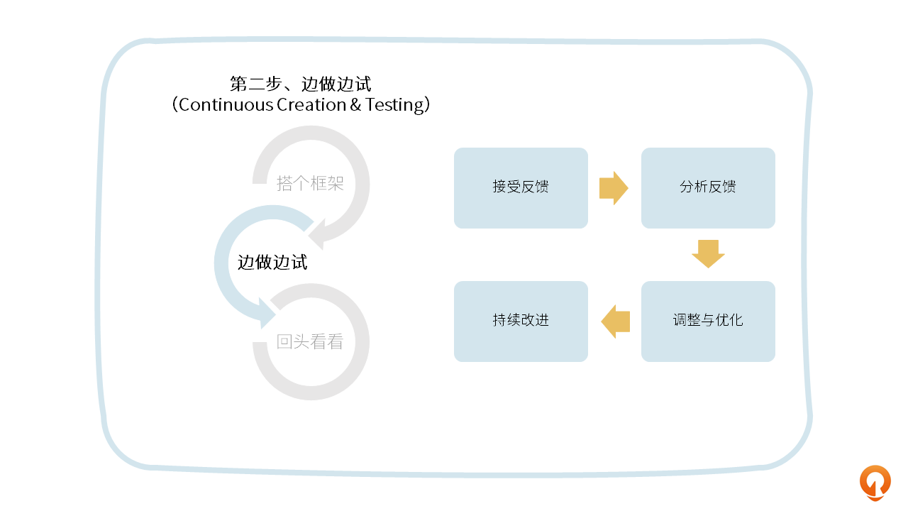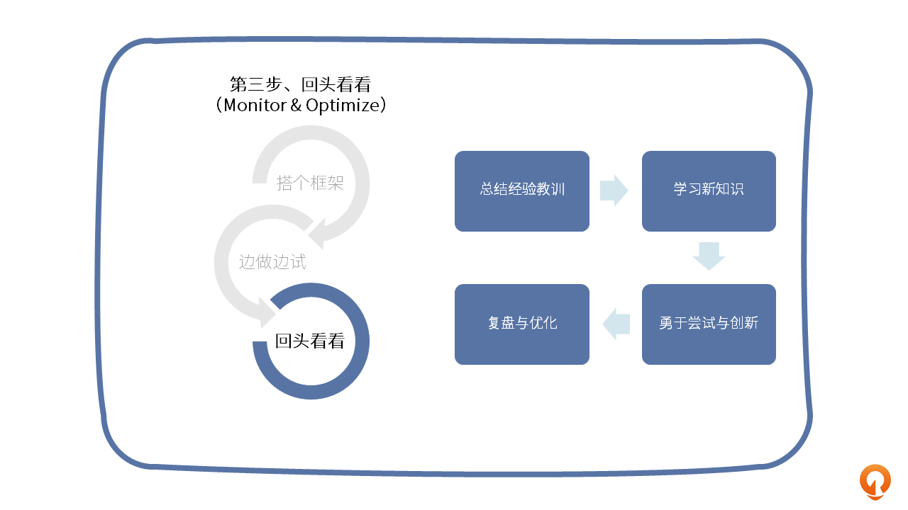 是否觉得这三个原则还是有些抽象呢?别担心,为了更易于记忆,我为它们重新命名了,分别是:“搭个框架”、“边做边试”和“回头看看”。