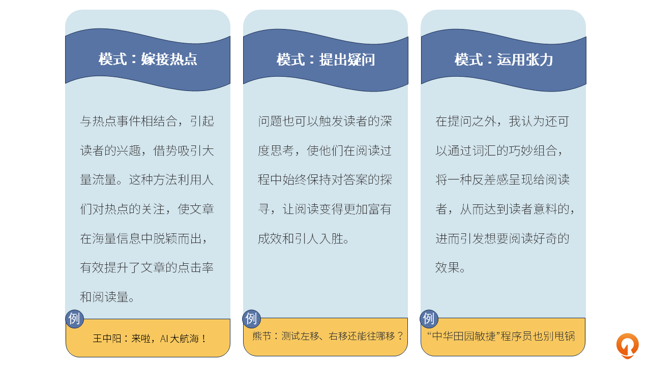 我参考了软件设计模式的思路,总结了一些文章“标题模式”(如图),希望能给你在起文章主题时提供一些灵感和参考。