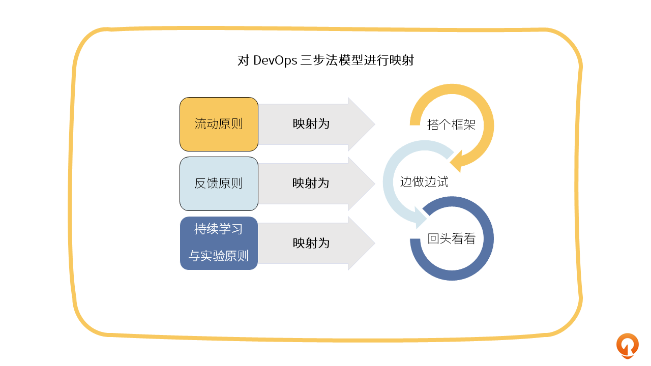 《凤凰项目》的作者 Gene Kim 给出的 DevOps 三步工作法实践原则是:流动原则、反馈原则、持续学习与实验原则(三步工作法请参考 这里)。
