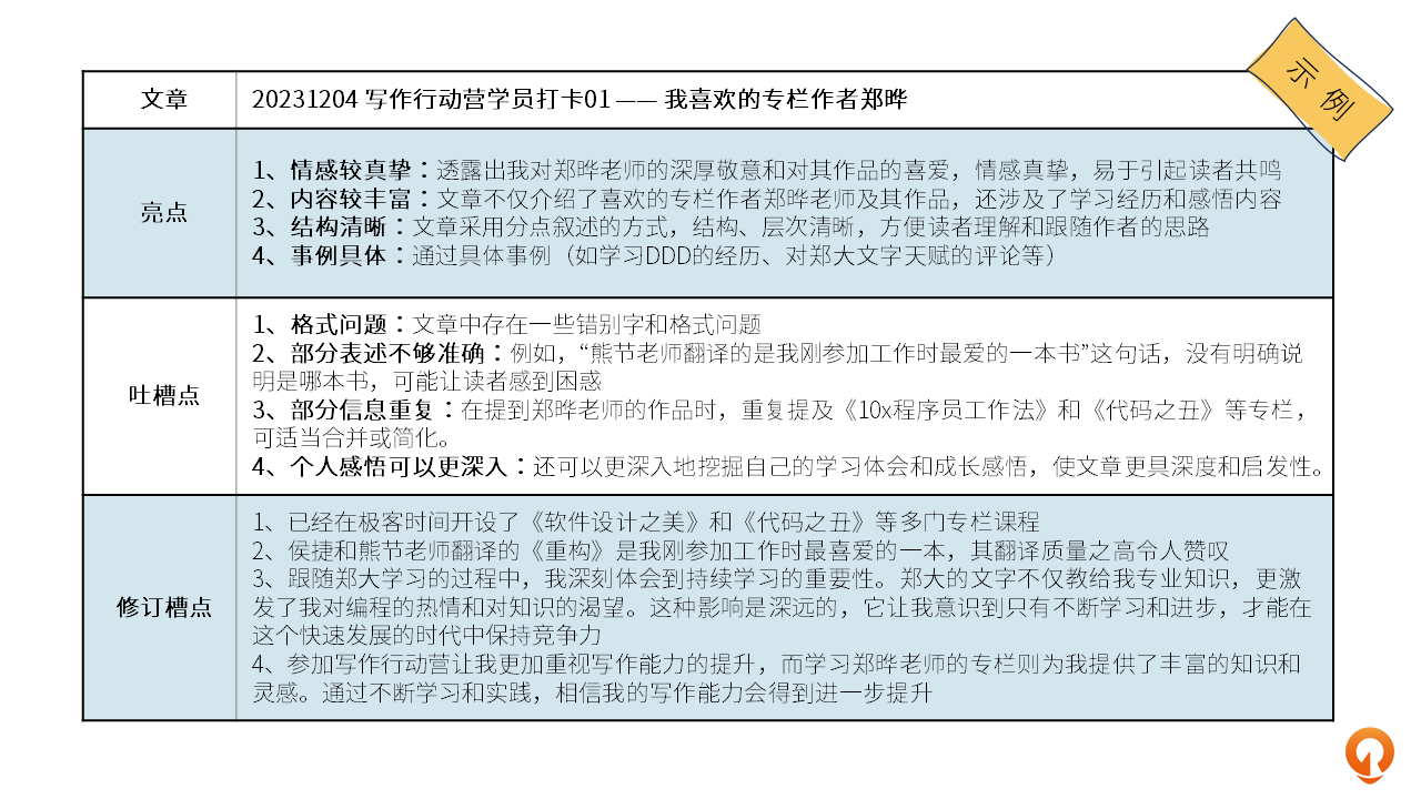 宇新老师,作为极客时间经验丰富的教研编辑,向我们阐述了“快写慢改”的核心思想,并再三强调优质文章是经过反复打磨而成的。她在行动营的彩蛋分享中传授给我们的“稿件修改三板斧”,让我们在自己搭建的文字房屋内像工匠那样细心雕琢、不断打磨。