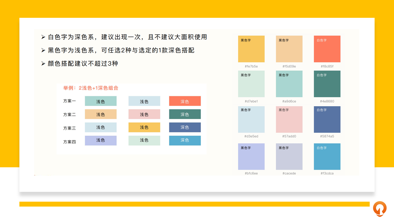 这里不得不提一下,极客时间的教研编辑宋文静老师,在行动营加餐直播中,给出了设计配图的几项宝贵建议,包括:内容的重要性、示意图和图片的清晰度、配色的统一性以及形式的规整性等关键要素,这些也让我在设计自己的配图、头图中深受启发,收获颇丰。下图就是宋老师给出的极客时间文章配色最佳实践,你可以收藏一下,直接使用上面组合中的颜色标识,来设计你自己的文章头图。