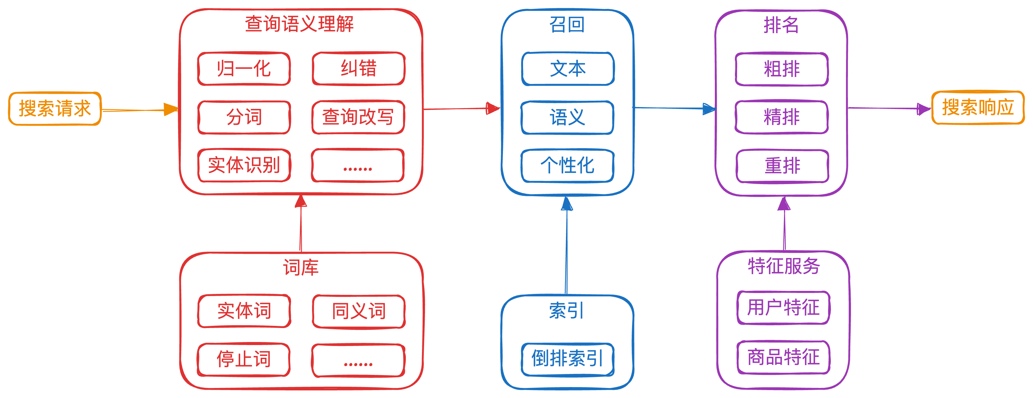 经过对市面上电商搜索业务的学习和调研,我得到了下面这张架构图。