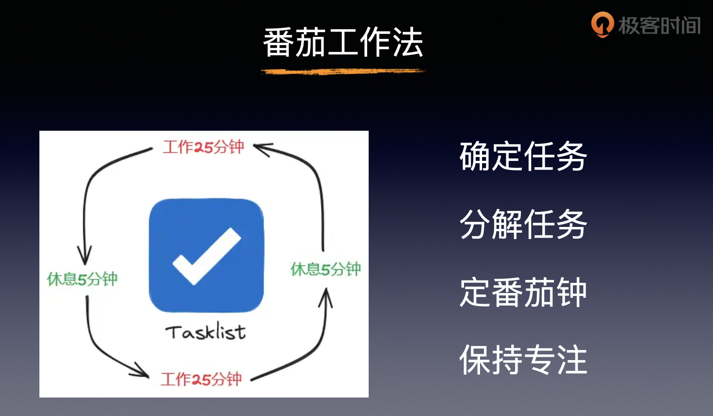 番茄工作法是简单易行的时间管理方法。简单来说,就是每25分钟休息5分钟,中途不允许做任何与该任务无关的事。完成4个番茄钟后,休息15-30分钟重复以上步骤,直到完成所有任务。一句话:确定任务、分解任务、定番茄钟、保持专注。