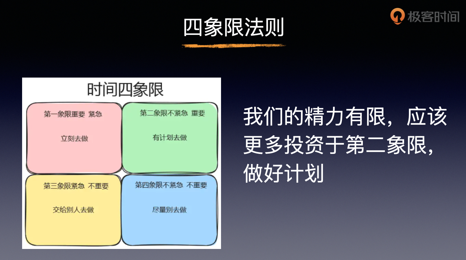 四象限法则是把工作根据轻重缓急进行区分,保证我们把时间合理地分配到任务上面。我们干活的时候遇到会议、被打断、临时性事项都可以考虑使用该法则。我们的精力有限,应该更多投资于第二象限,做好计划。