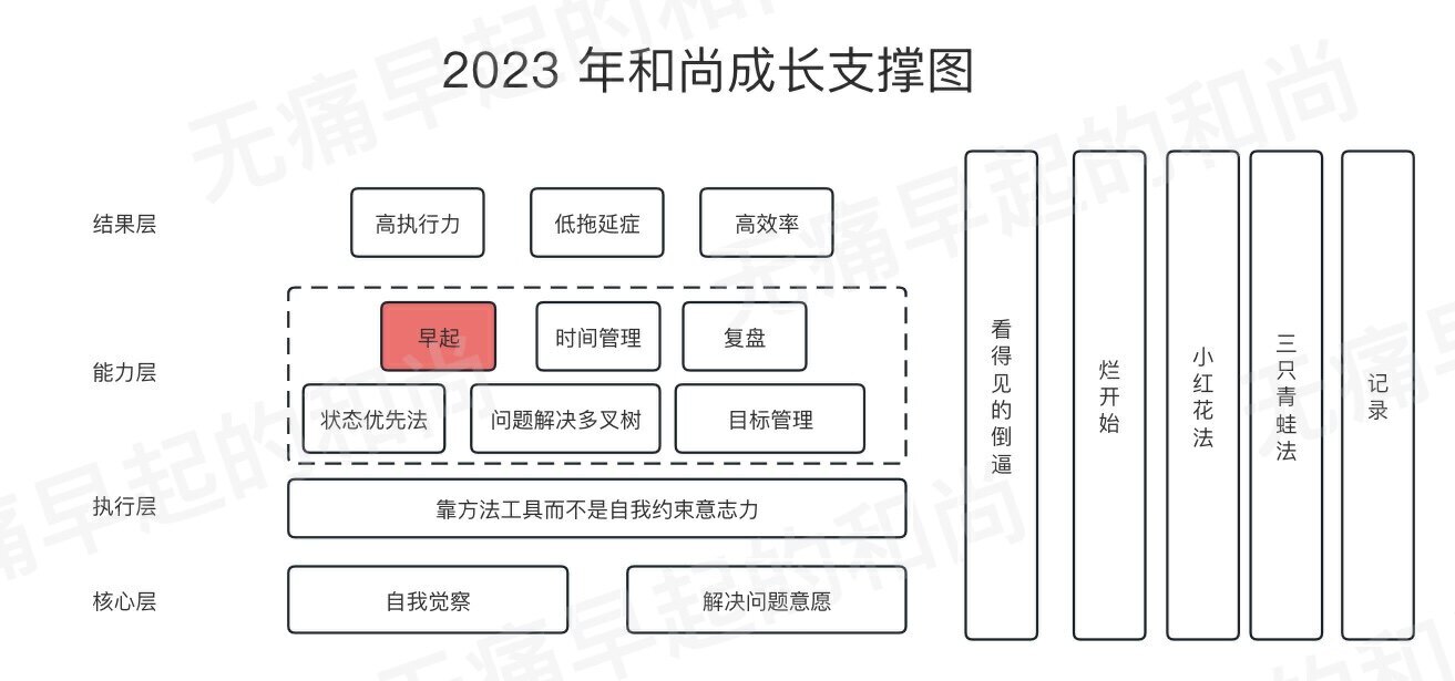 这个复盘我总结了一张图,叫“2023 年和尚成长支撑图”。我会结合一个个具体的案例来和你分享。