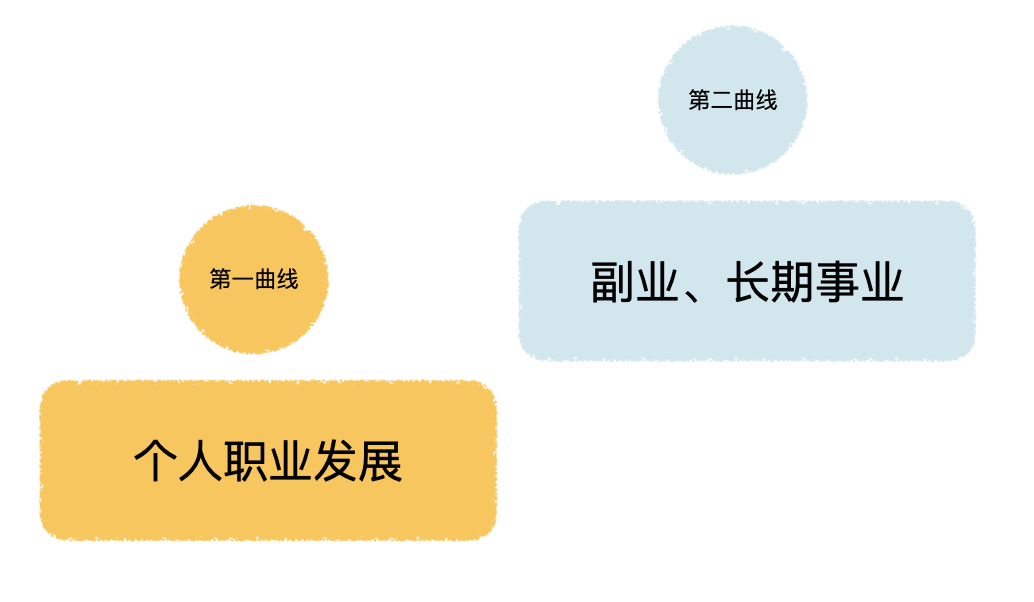 - 第二曲线:增加收入的副业、可以延续自己的职业生涯、甚至可以是干一辈子的事业