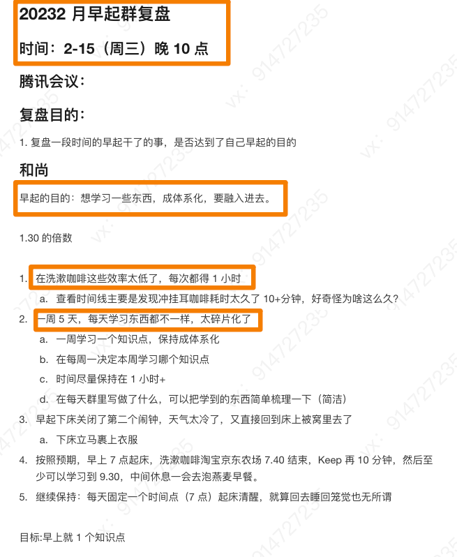 23 年 2 月,第一次复盘,我开始尝试到了复盘的“甜头”,因为喜欢被人认可、复盘可以让我倒逼思考、思考迭代带来成长、因为进步成长被人夸。在第一次复盘思考的时候,我发现了自己早起的问题:早起效率低、早起学习碎片化,发现问题就是一个好的开始。