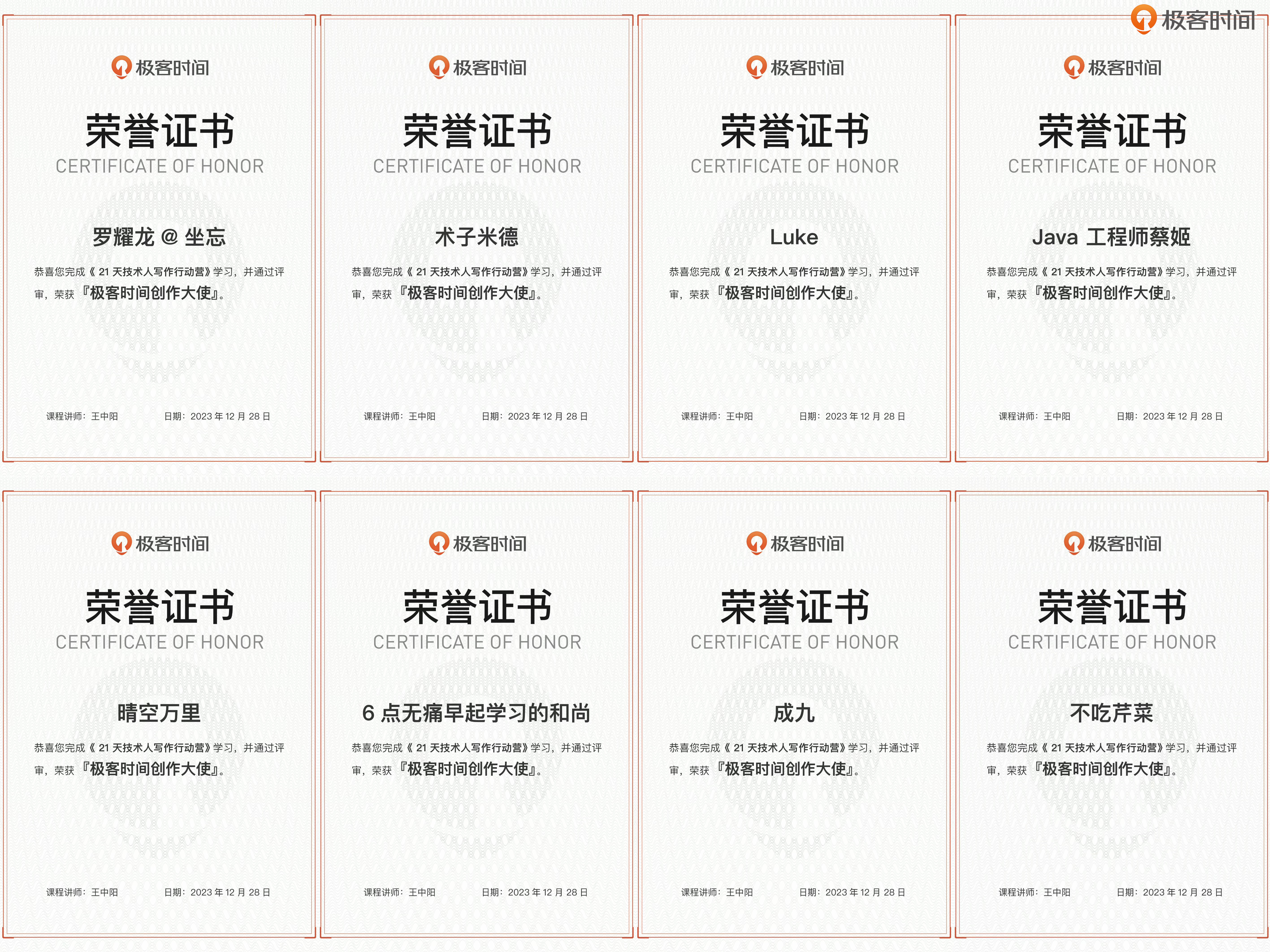 这门公开课也是“同学的课”,他们来自2023年12月极客时间出品的“21天技术人写作行动营”。行动营结束,根据大家的作业评选出8位极客时间创作大使。这个课程的内容就是每一位创作大使同学的2023年成长复盘,每个人分享的角度都不一样,给我们不同维度的启发。